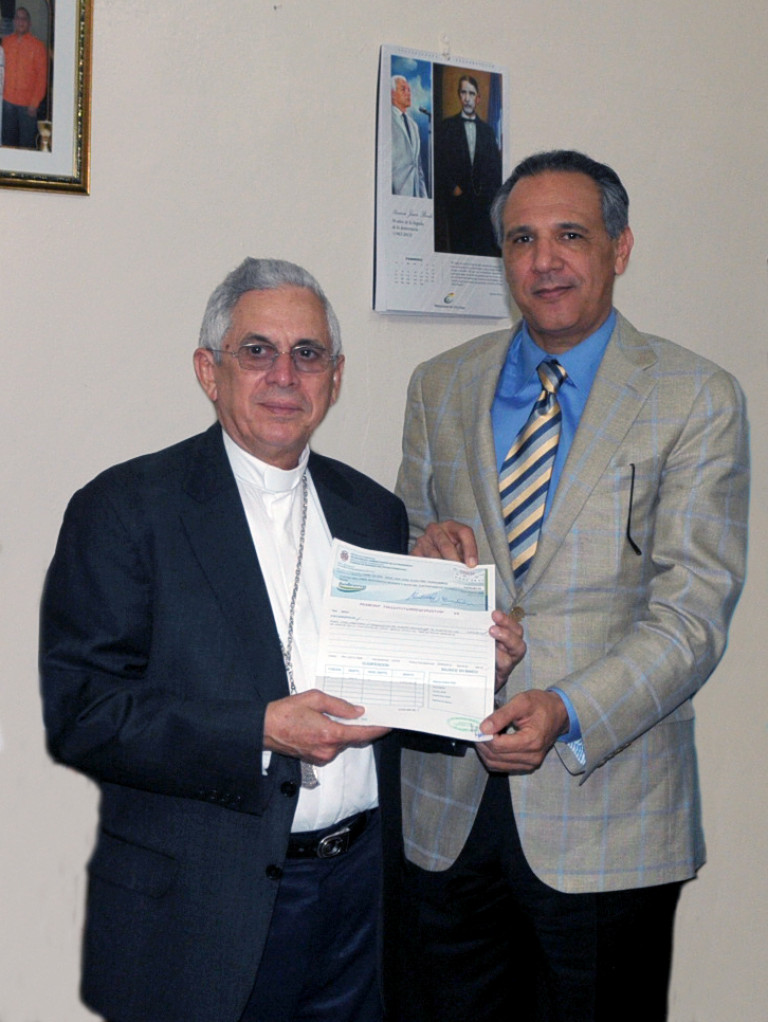 Monseñor José Grullón Estrella, obispo de la diócesis de San Juan de la Maguana y presidente de la Fundación de Desarrollo de Azua, San Juan de la Maguana y Elías Piña (FUNDASEP), recibe un cheque de 4.6 millones de pesos de manos del ministro Administrativo de la Presidencia, José Ramón Peralta.