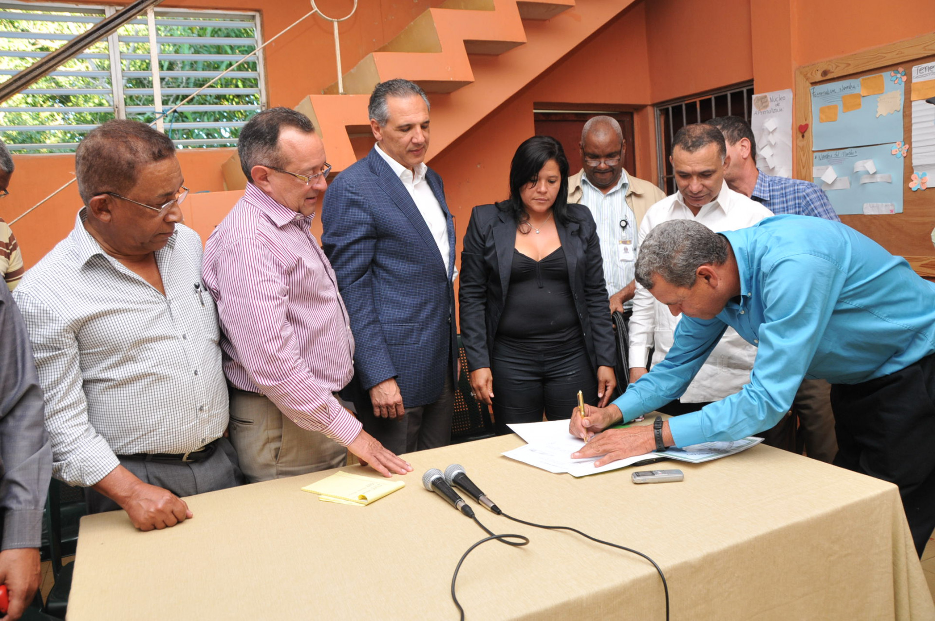 Productores de Hacienda Estrella firman el documento que confirma que recibieron de parte de José Ramón Peralta, ministro Administrativo de la Presidencia, un cheque de 2.5 millones de pesos para mejor la producción de arroz y cereza, en esa zona.