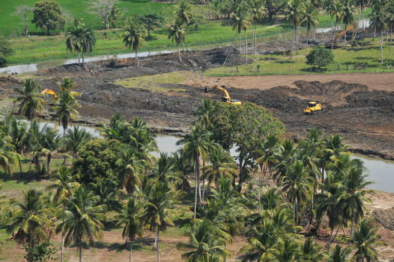 El Gobierno del presidente Danilo Medina cumple con productores del Bajo Yuna, en la provincia Duarte, con el trabajo que realizan estos bulldozers, de remoción de tierra y dragado para que las aguas del río Yuna retomen su cauce.