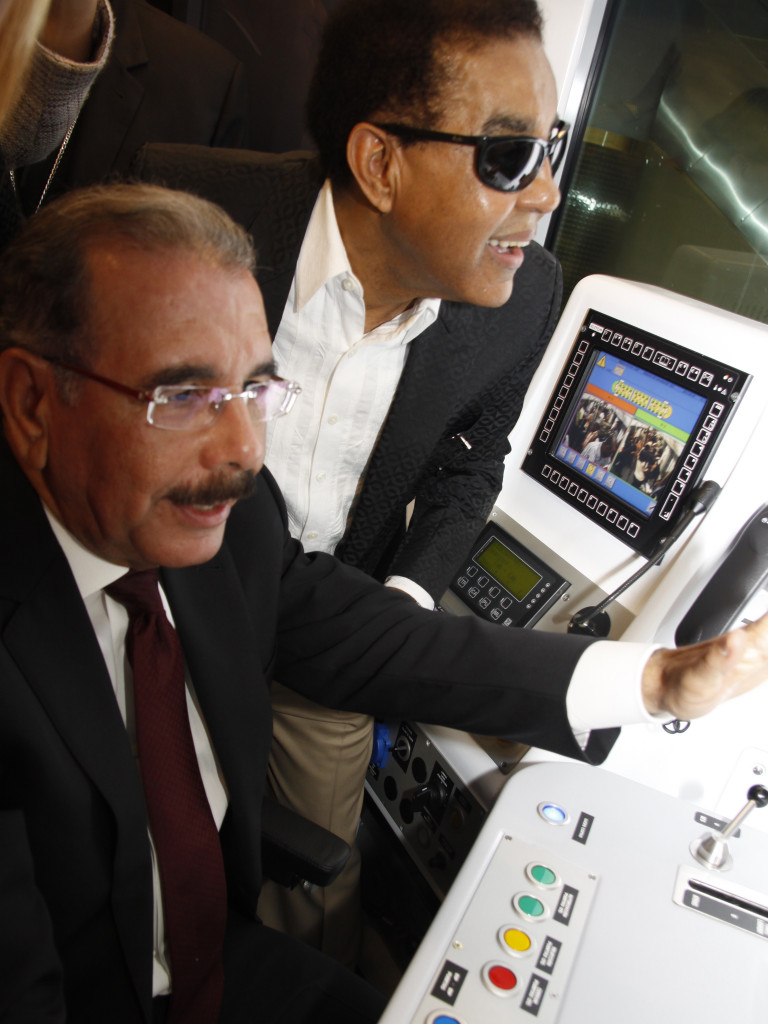 El presidente Danilo Medina en la cabina de mando de uno de los trenes de la Línea 2 del Metro de Santo Domingo.Le acompaña, Diandino Peña, director de la Oficina para el Reordenamiento del Transporte (OPRET).