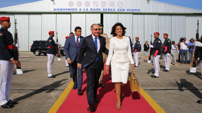 El presidente Danilo Medina y la primera dama Cándida Montilla de Medina se dirigen al avión en la Base Aérea de San Isidro que los llevará a Panamá para asistir a la VII Cumbre de las Américas 2015 a celebrarse el 10 y 11 de abril.