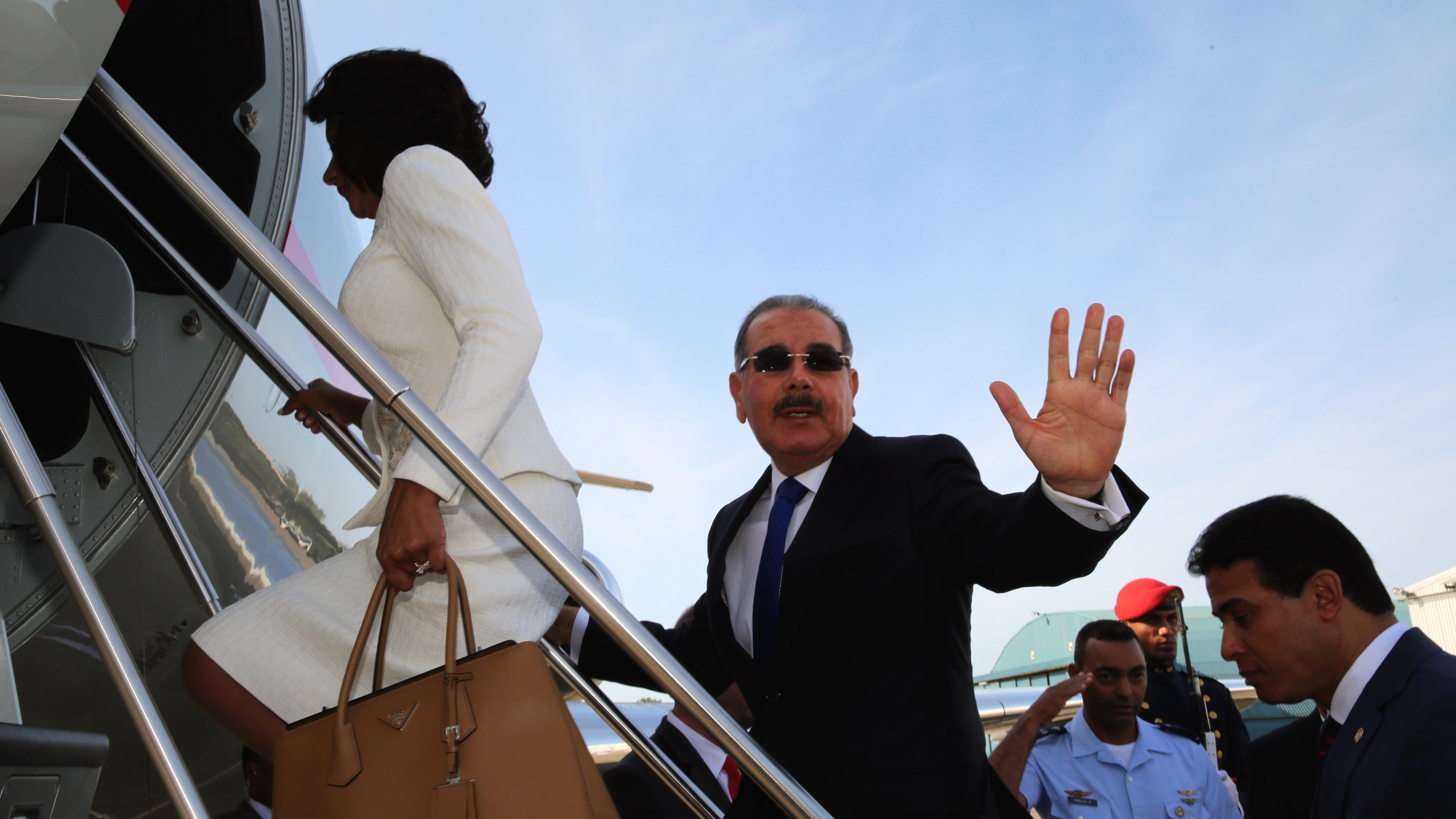 El presidente Danilo Medina y la primera dama Cándida Montilla de Medina abordan al avión en la Base Aérea de San Isidro que los llevará a Panamá para asistir a la VII Cumbre de las Américas 2015 a celebrarse el 10 y 11 de abril.