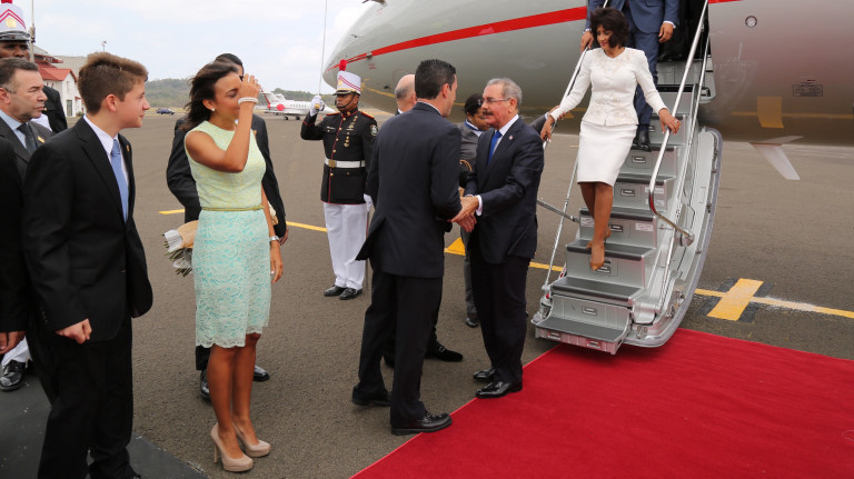 El presidente Danilo Medina, acompañado de la primera dama Cándida Montilla de Medina, llegó al Aeropuerto Internacional Panamá Pacífico, donde fue recibido por el embajador dominicano en Panamá, César Medina; el vicecanciller panameño Miguel Hincapié; y el director de Protocolo y Ceremonial de esa nación, embajador Roberto Zúñiga, para su participación en la VII Cumbre de las Américas a celebrase el 10 y 11 de abril.
