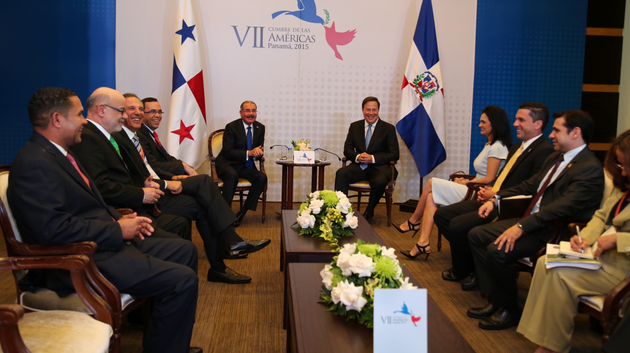 Los presidentes Danilo Medina, de República Dominicana; y Juan Carlos Varela, de Panamá, y sus respectivas comitivas, durante el encuentro bilateral en el marco de la VII Cumbre de las Américas a celebrarse el 10 y 11 de abril.