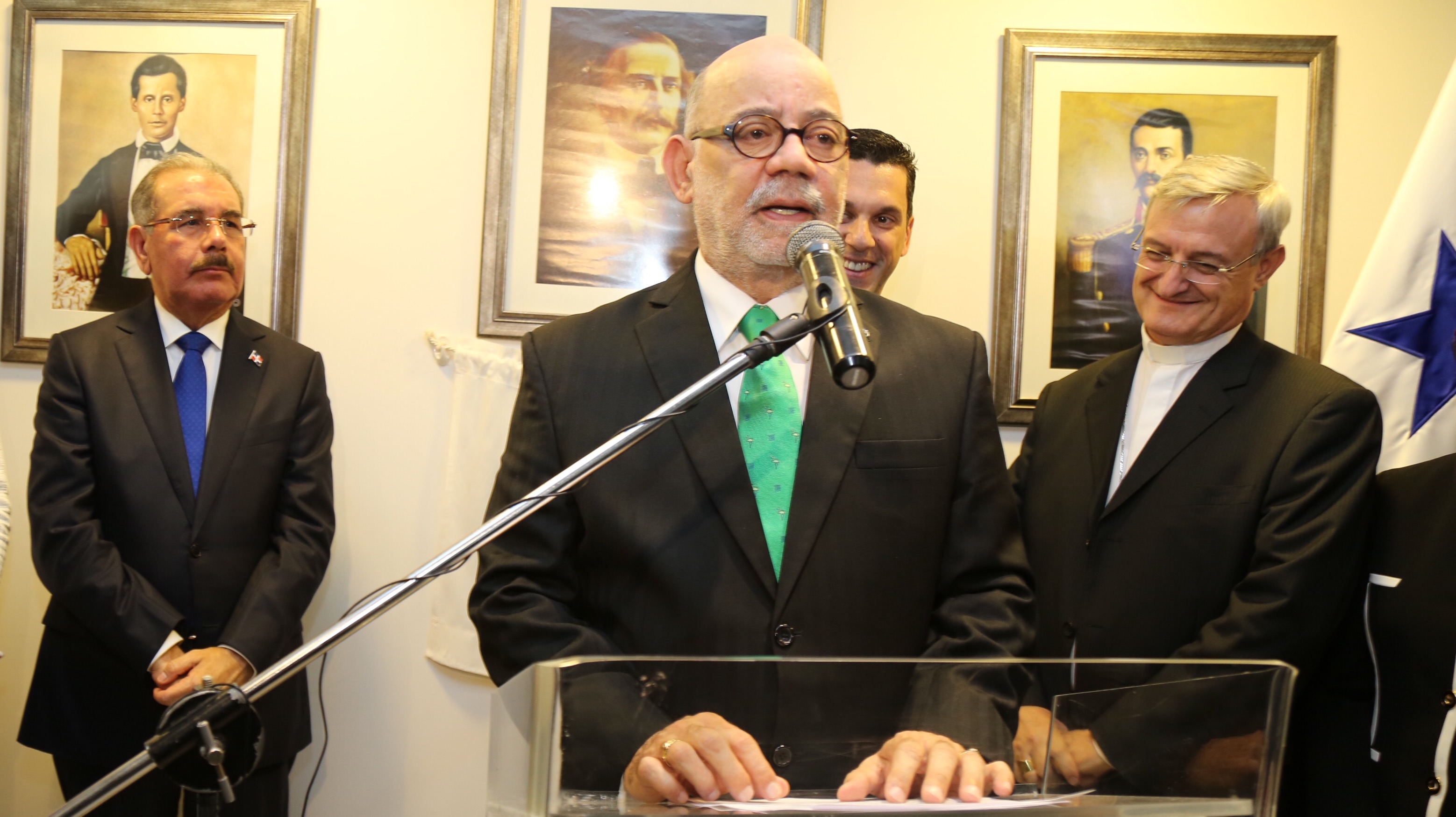 El embajador César Medina expresa su discurso ante el presidente Danilo Medina, funcionarios, invitados y comunicadores, durante la inauguración de la sede de la Embajada de República Dominicana en Panamá.