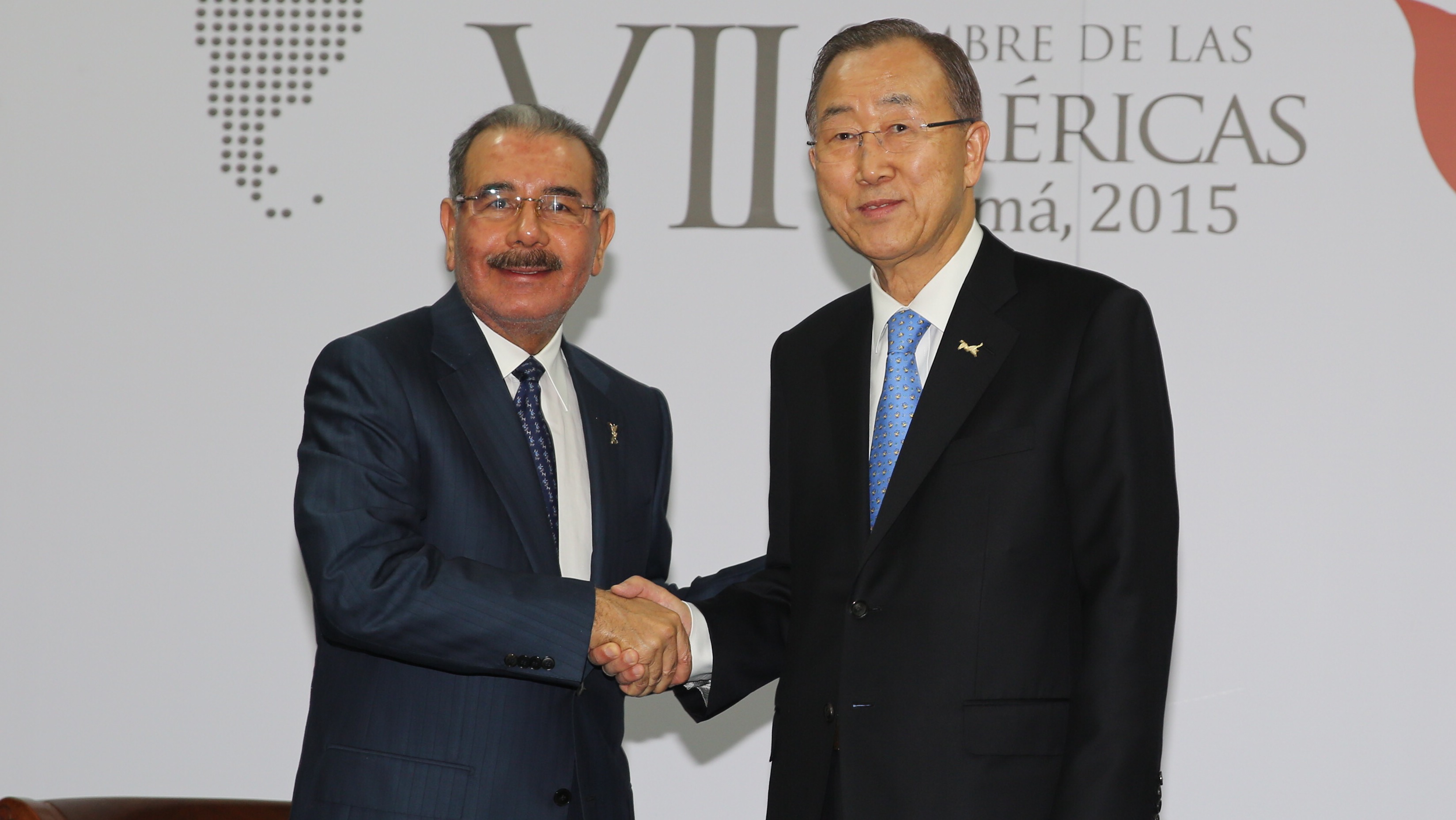 El presidente Danilo Medina y Ban Ki-moon, secretario general de la ONU, se saludan durante su encuentro bilateral en el marco de la VII Cumbre de las Américas 2015 en Panamá.