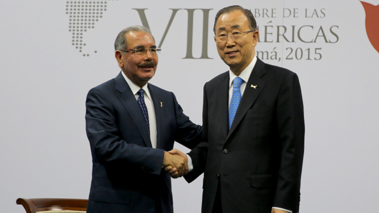 El presidente Danilo Medina y Ban Ki-moon, secretario general de la ONU, se saludan durante su encuentro bilateral en el marco de la VII Cumbre de las Américas 2015 en Panamá.