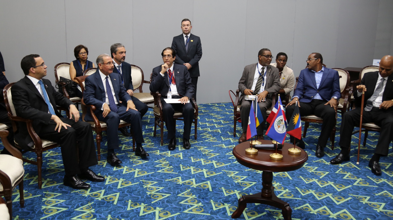 El presidente Danilo Medina encabeza la reunión multilateral con los gobernantes Gastón Browne, de Antigua y Barbuda; Dean Barrow, de Belice; Michel Martelly, de Haití; y Perry Christie, de Bahamas; en el marco de la VII Cumbre de las Américas 2015 en Panamá.