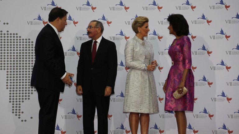 El presidente Danilo Medina y su esposa, Cándida Montilla de Medina, fueron recibidos por el presidente y la primera dama de Panamá, Juan Carlos Varela y Lorena Castillo de Varela. a su llegada al Centro de Convenciones ATLAPA para su participación en la ceremonia inaugural VII Cumbre de las Américas 2015, en Panamá.