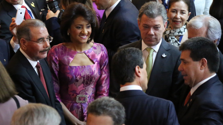 El presidente Danilo Medina y la primera dama Cándida Montilla de Medina comparten con varios mandatarios durante el acto inaugural de la VII Cumbre de las Américas 2015 en Panamá.