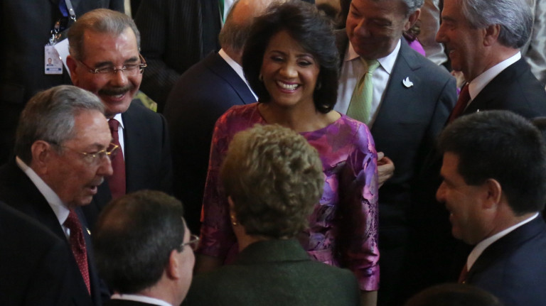 El presidente Danilo Medina y la primera dama Cándida Montilla de Medina conversan con los mandatarios Raúl Castro, de Cuba; y Dilma Rousseff, de Brasil; durante el acto inaugural de la VII Cumbre de las Américas 2015 en Panamá.