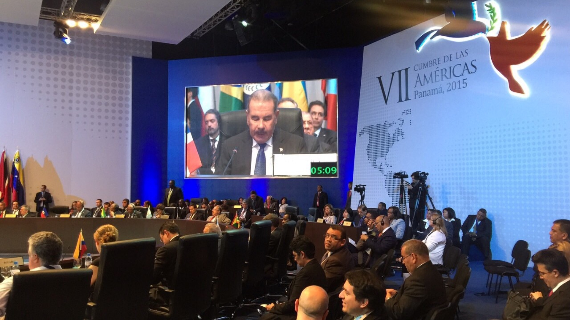 El presidente Danilo Medina expone su discurso en la VII Cumbre de las Américas 2015 en Panamá ante los Jefes de Estado y de Gobierno del hemisferio, donde refirió que la República Dominicana está implicada en la lucha contra el tráfico de narcóticos y contra el crimen organizado.