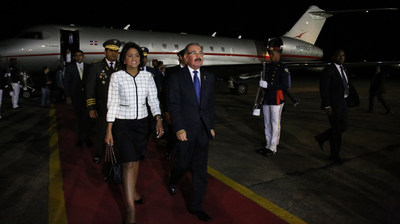 El presidente Danilo Medina y la primera dama Cándida Montilla de Medina a su llegada a República Dominicana luego de participar en la VII Cumbre de las Américas 2015 en Panamá. Foto: Presidencia República Dominicana