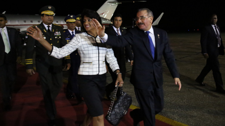 El presidente Danilo Medina y la primera dama Cándida Montilla de Medina saludan a su llegada a República Dominicana luego de participar en la VII Cumbre de las Américas 2015 en Panamá.