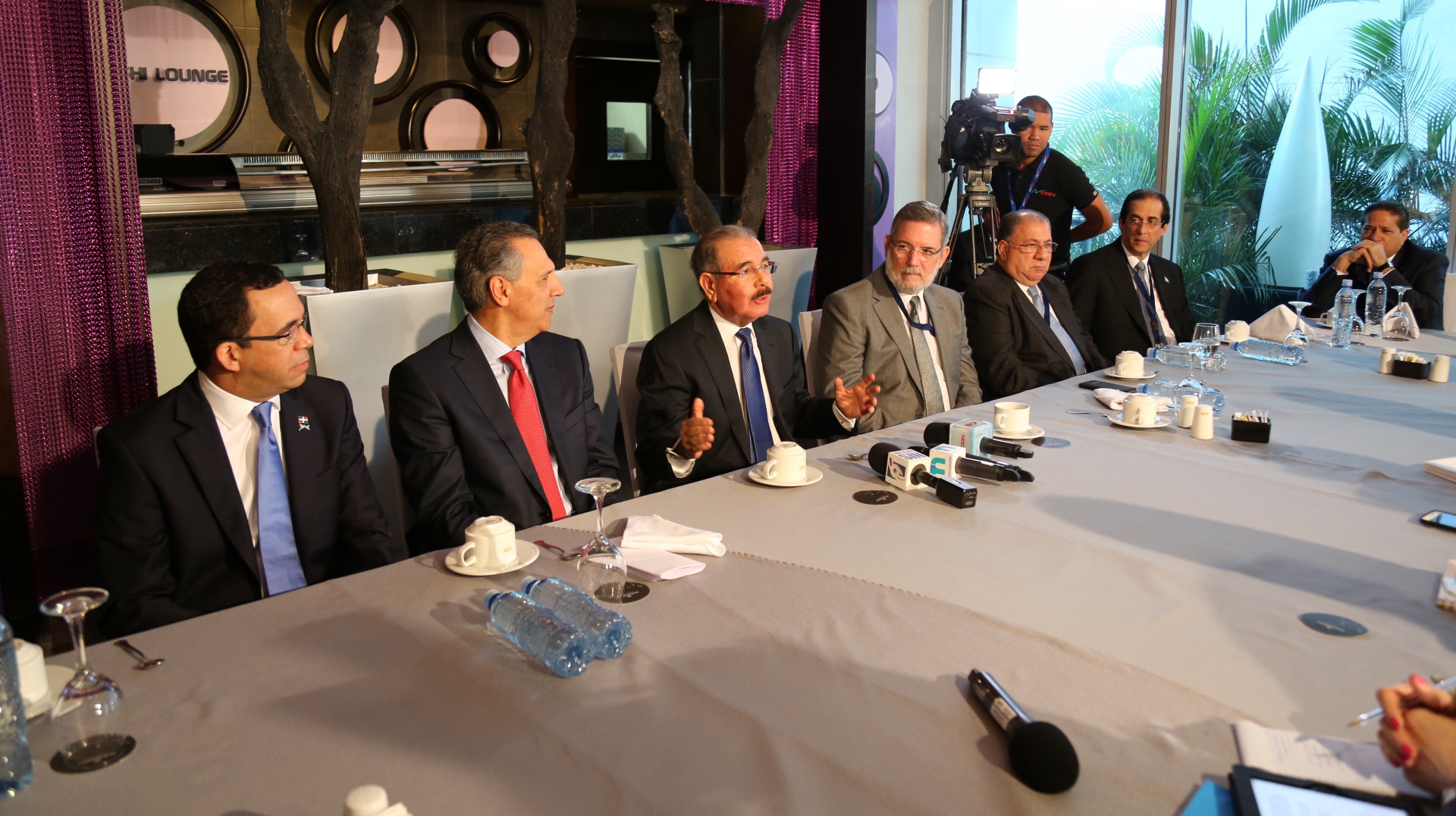 Durante el conversatorio del presidente Danilo Medina con los comunicadores dominicanos, le acompañaron Roberto Rodríguez Marchena, portavoz del gobierno y director general de Comunicación; los ministros Andrés Navarro, de Relaciones Exteriores, José Ramón Peralta; Administrativo de la Presidencia; José Ramón Fadul, de Interior y Policía; y el ministro de la Presidencia, Gustavo Montalvo.