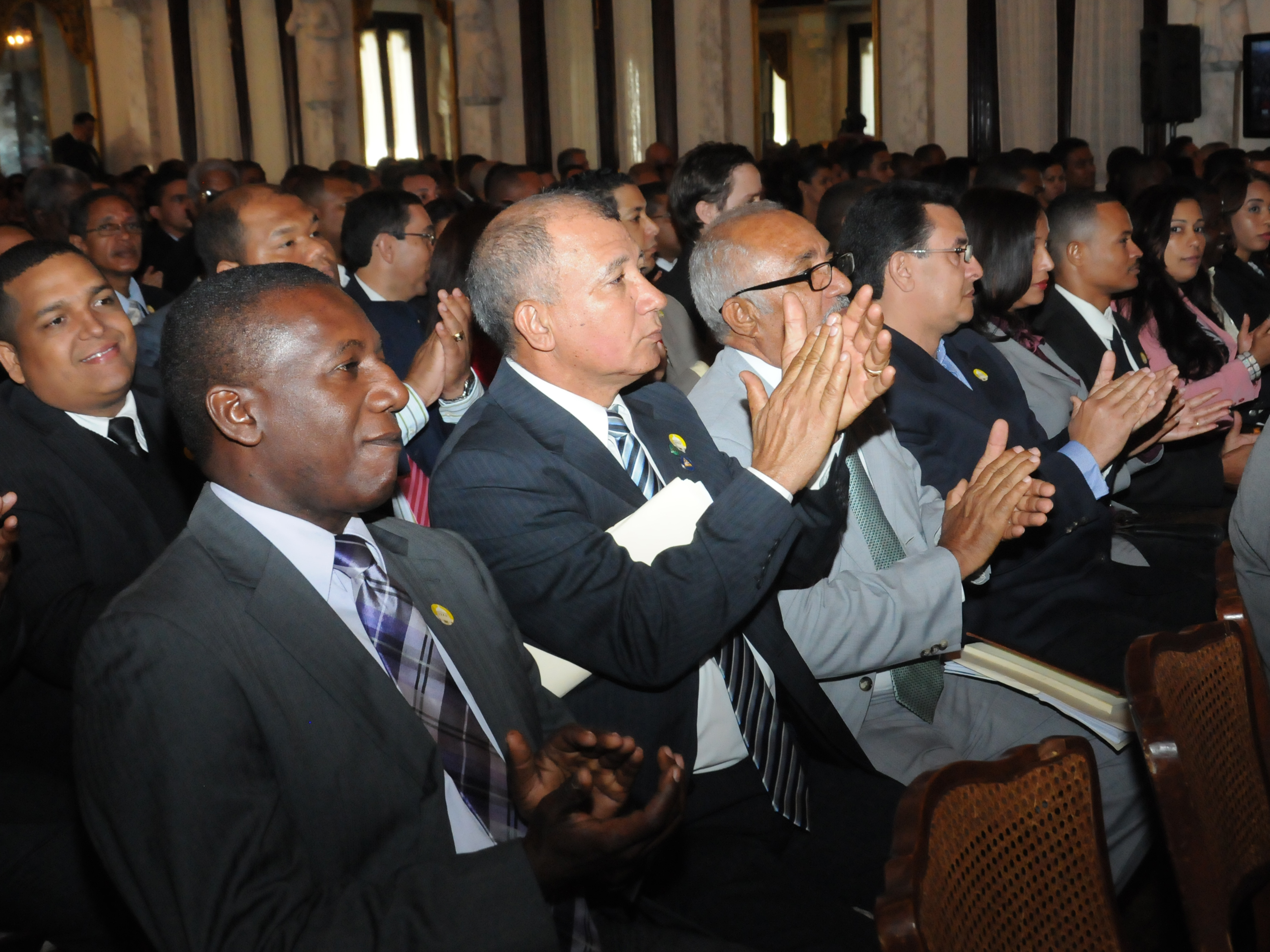 Ingenieros ganadores de obras en el segundo sorteo de infraestructuras escolares aplauden mientras algunos de sus colegas son llamados a retirar sus cheques, en un acto celebrado en el Palacio Nacional.