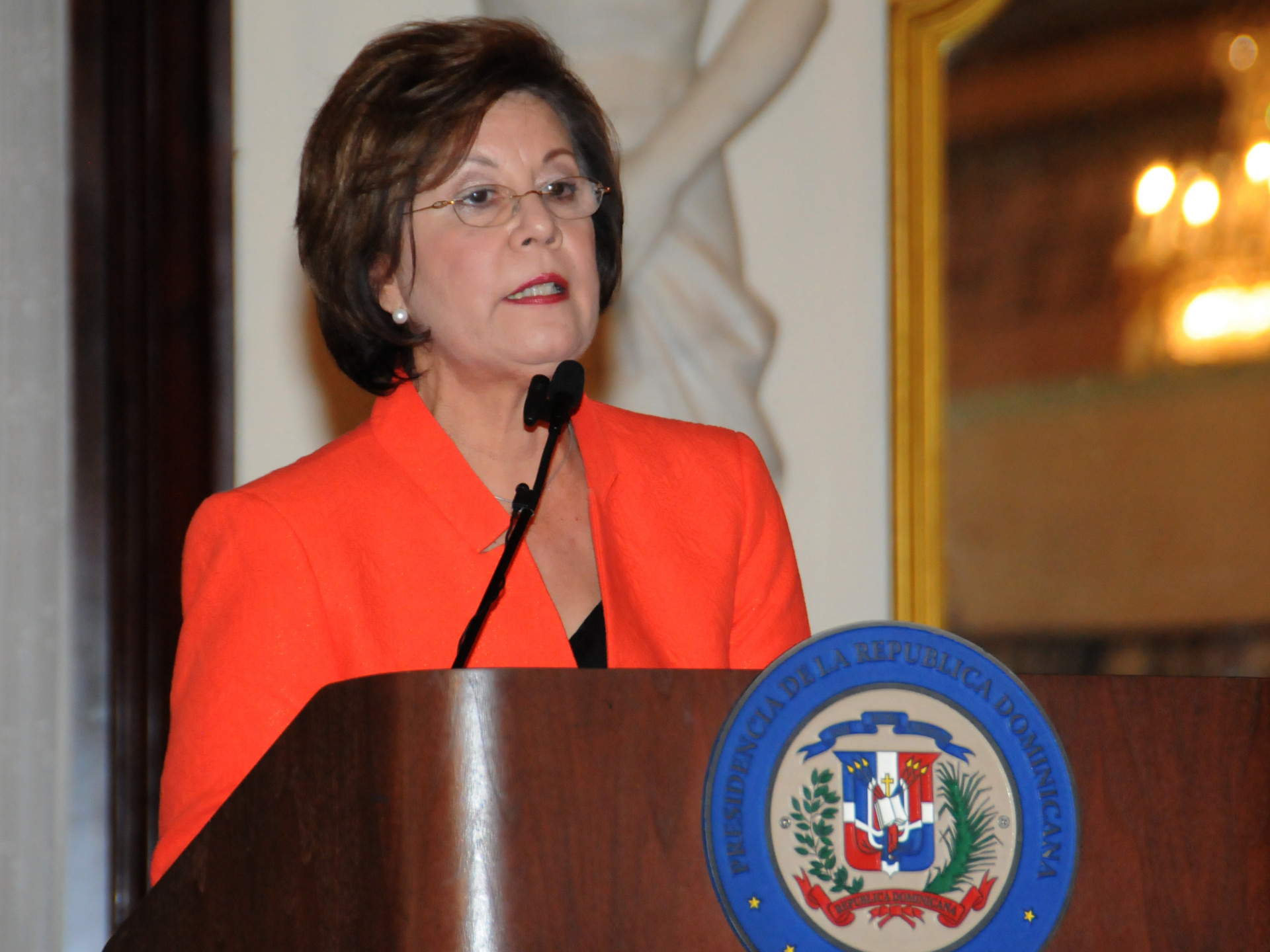La ministra de Educación, Josefina Pimentel, se dirige a los presentes, en el Palacio Nacional, en el acto de entrega de cheques a los ingenieros e ingenieras ganadores en el segundo sorteos de infraestructuras escolares.