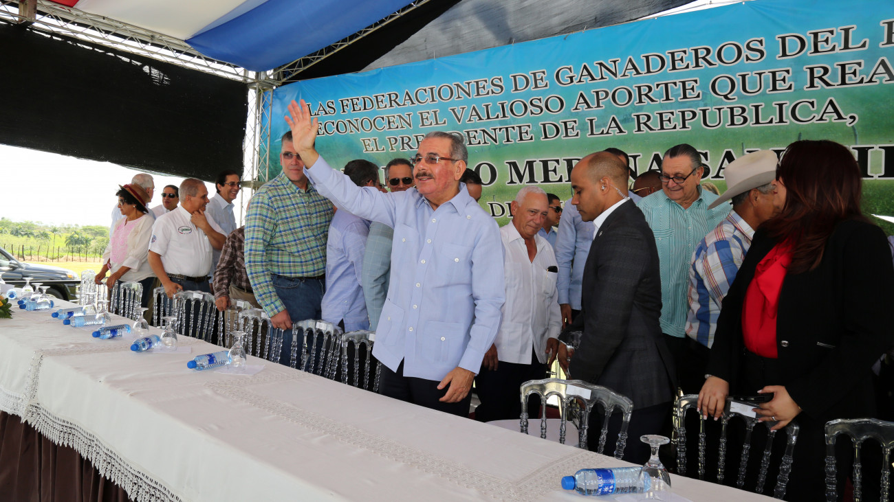 El presidente Danilo Medina saluda a los asistentes a su llegada al acto de reconocimiento que recibió de los ganaderos.