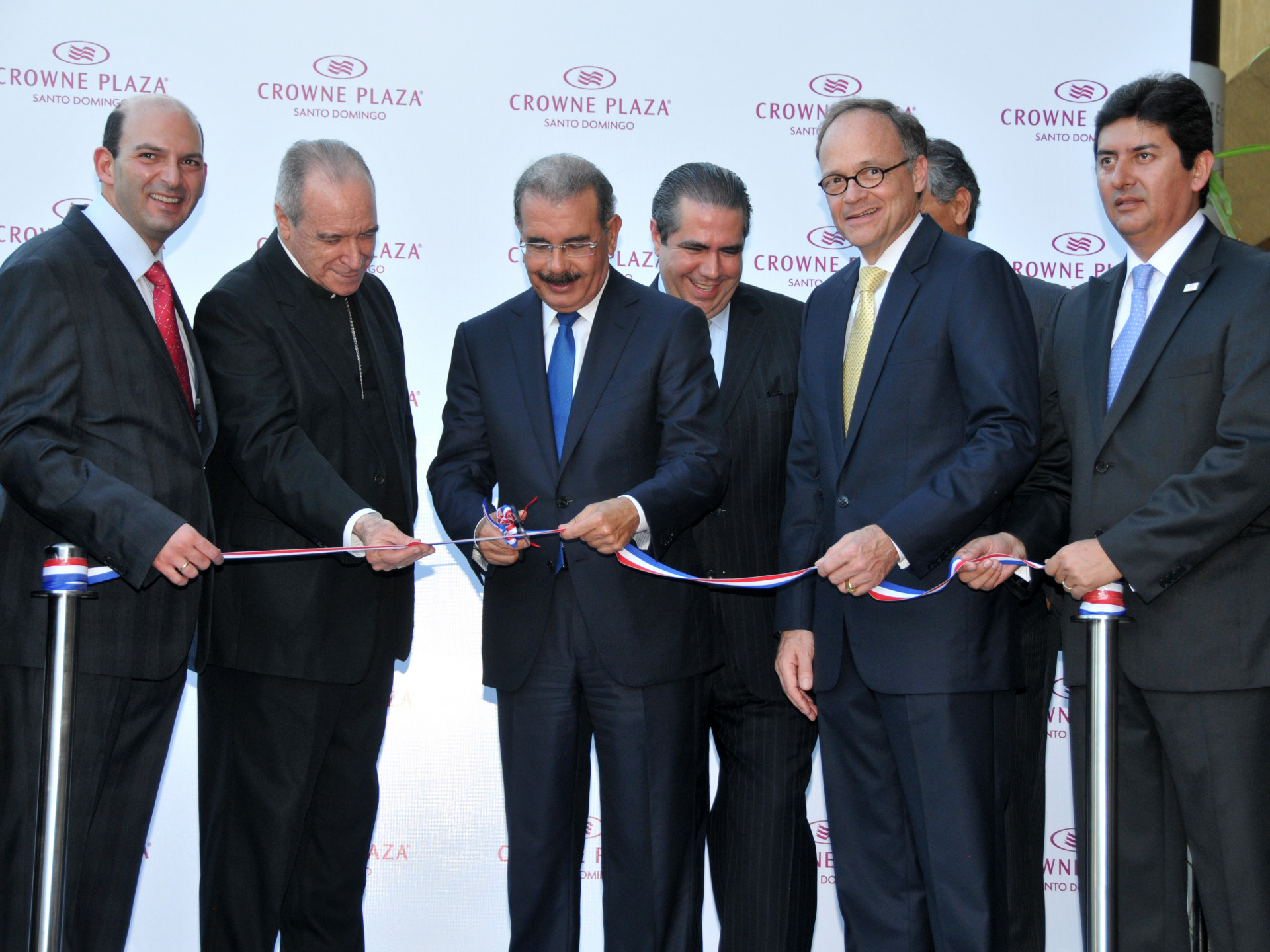 El presidente Danilo Medina corta la cinta para aperturar el hotel Crowne Plaza Santo Domingo. Le acompañan, el cardenal Nicolás de Jesús López Rodríguez; el ministro de Turismo, Francisco Javier García; y ejecutivos del hotel.