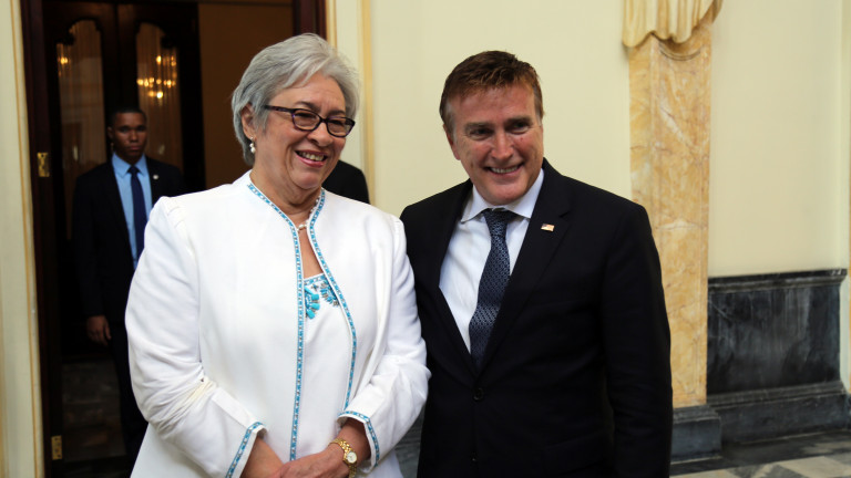 La ministra de Salud Pública, Altagracia Guzmán Marcelino; y el embajador de los Estados Unidos en República Dominicana, James Brewster; comparten durante el acto de lanzamiento del "Plan Estratégico Nacional (PEN) para la Prevención y el Control de las ITS, VIH y Sida"
