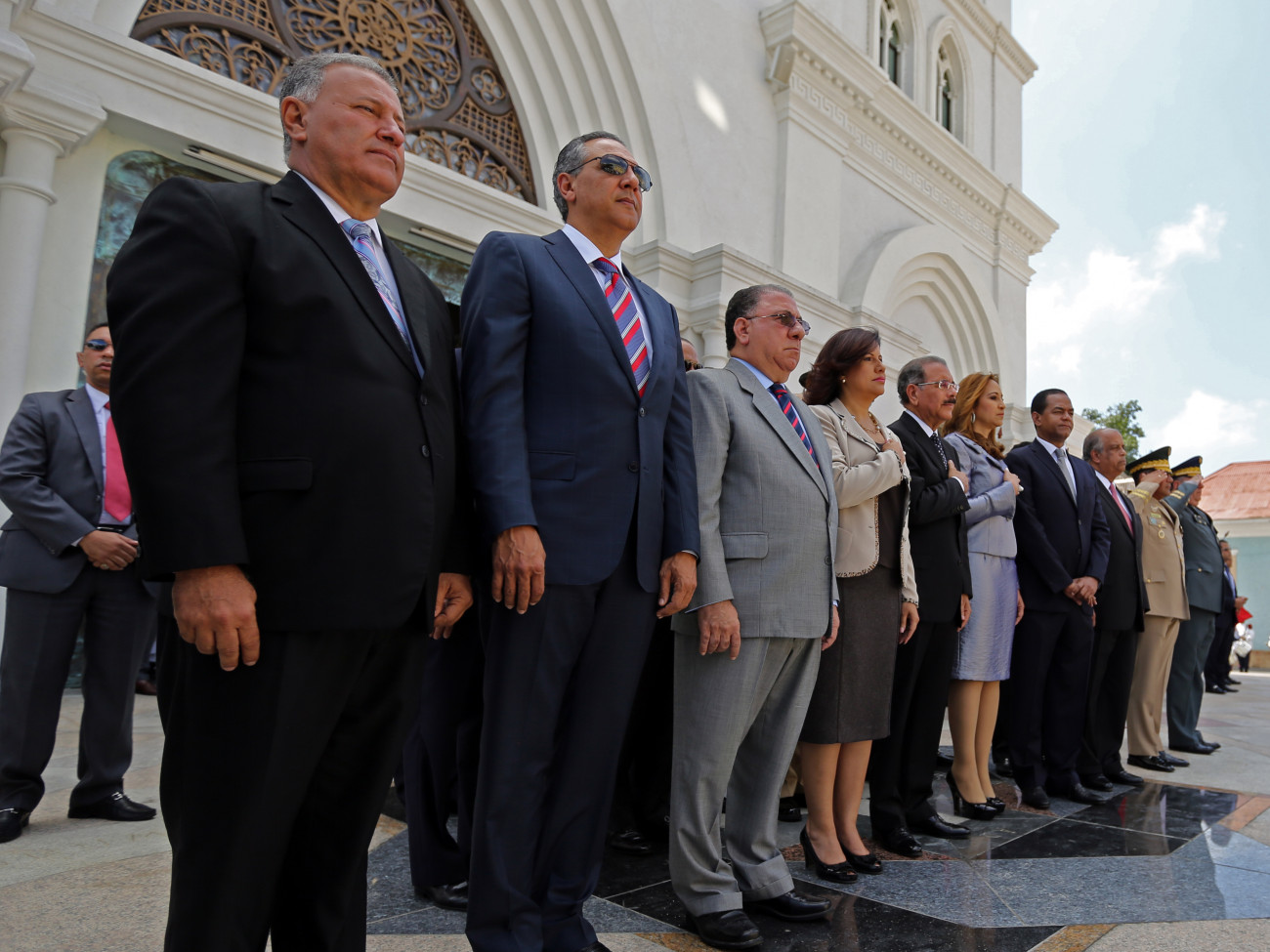 El presidente de la República, Danilo Medina, y su comitiva mientras escuchan las notas del Himno Nacional, frente a la catedral de Santiago.