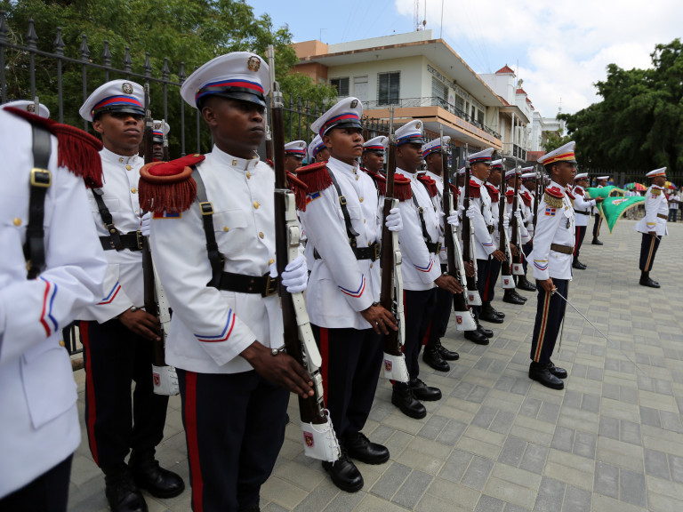 Militares rinden honores al presidente de la República, Danilo Medina, frente a la catedral de Santiago de los Caballeros, donde asistió al tedeum conmemorativo a la Batalla del 30 de Marzo.