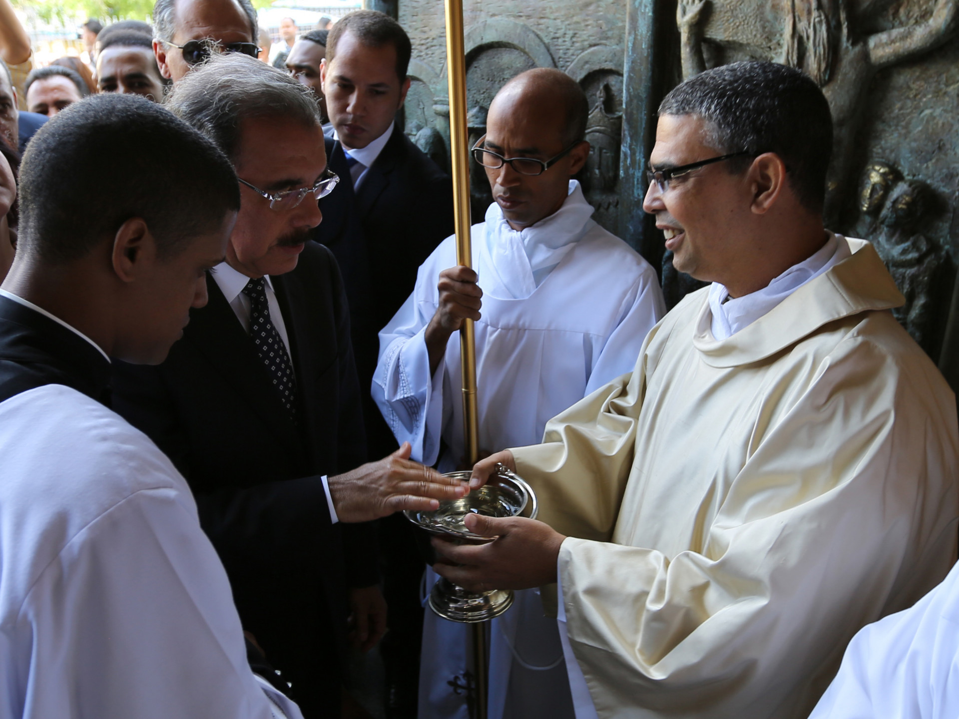 El presidente Danilo Medina moja su mano con agua bendita previo al tedeum celebrado en la catedral de Santiago de los Caballeros, en conmemoración al 169 aniversario de la Batalla del 30 de Marzo.