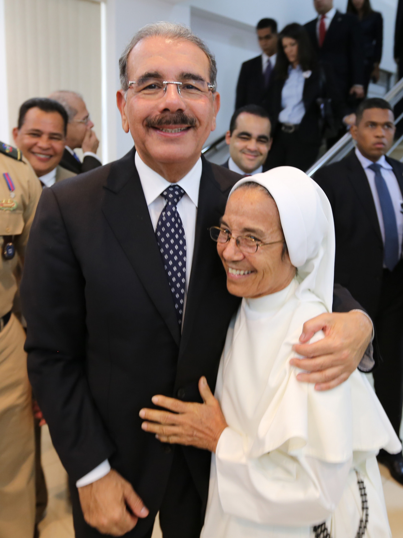 El presidente de la República, Danilo Medina, recibe un efusivo saludo de una monja, en Santiago de los Caballeros, previo al almuerzo del mandatario, en esa ciudad, donde se conmemora el 169 aniversario de la Batalla del 30 de Marzo.