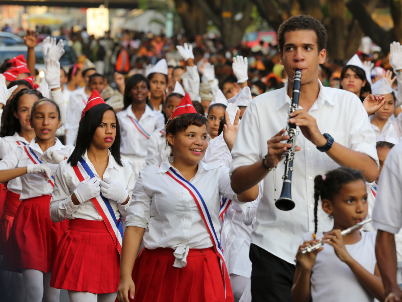Músicos de un bastón ballet municipal ejecuta para que centenares de estudiantes marchen en el desfile cívico militar, en Santiago de los Caballeros, al cumplirse el 169 aniversario de la Batalla del 30 de Marzo.