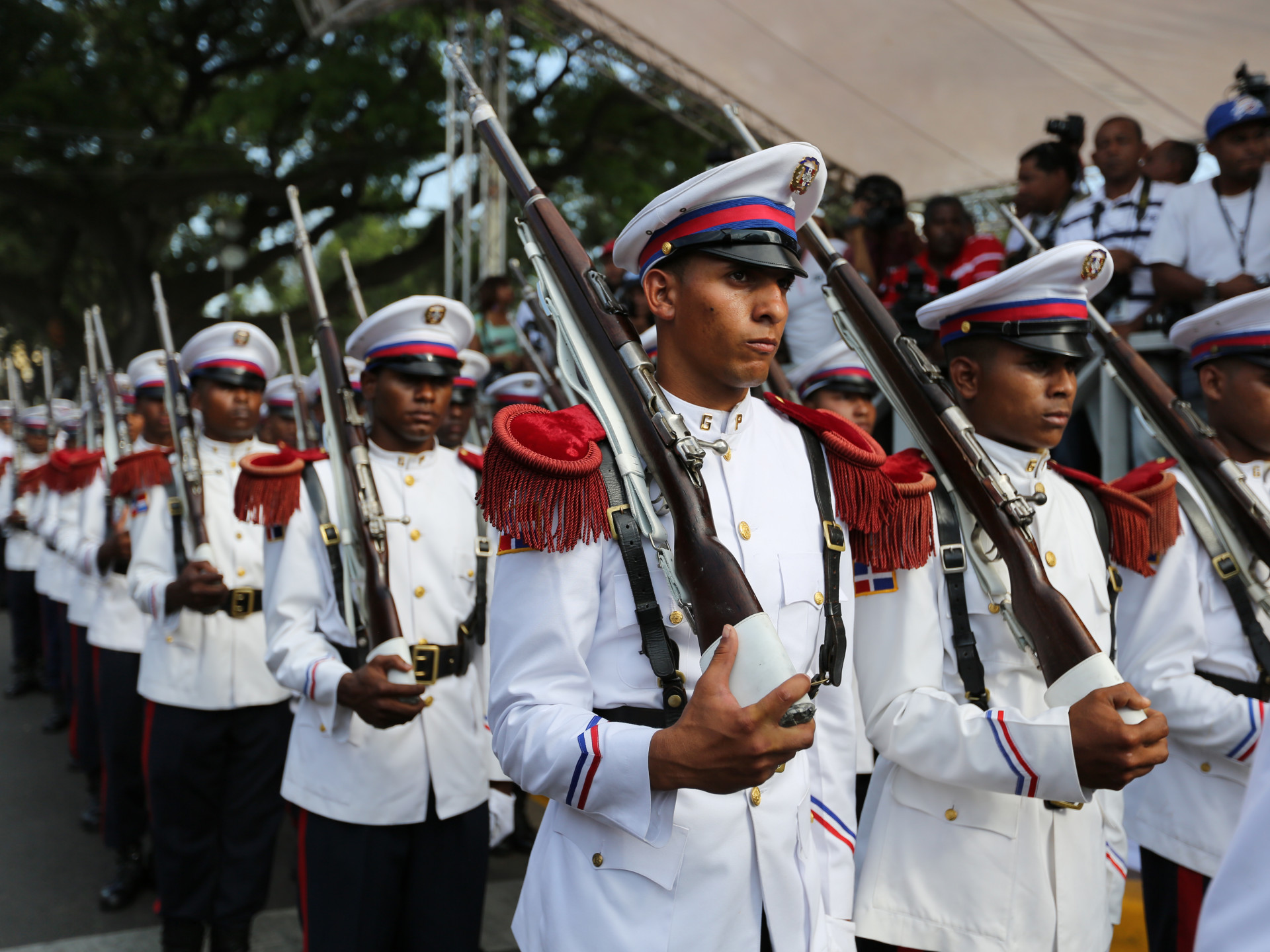 Un pelotón de la Guardia Presidencial se exhibe en el desfile cívico militar, en Santiago de los Caballeros, celebrando el 169 aniversario de la Batalla del 30 de Marzo.