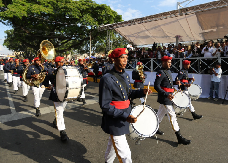 Una banda de música interpretando ritmos de marchas durante el desfile, en santiago de los Caballeros, por la Batalla del 30 de Marzo de 1844.