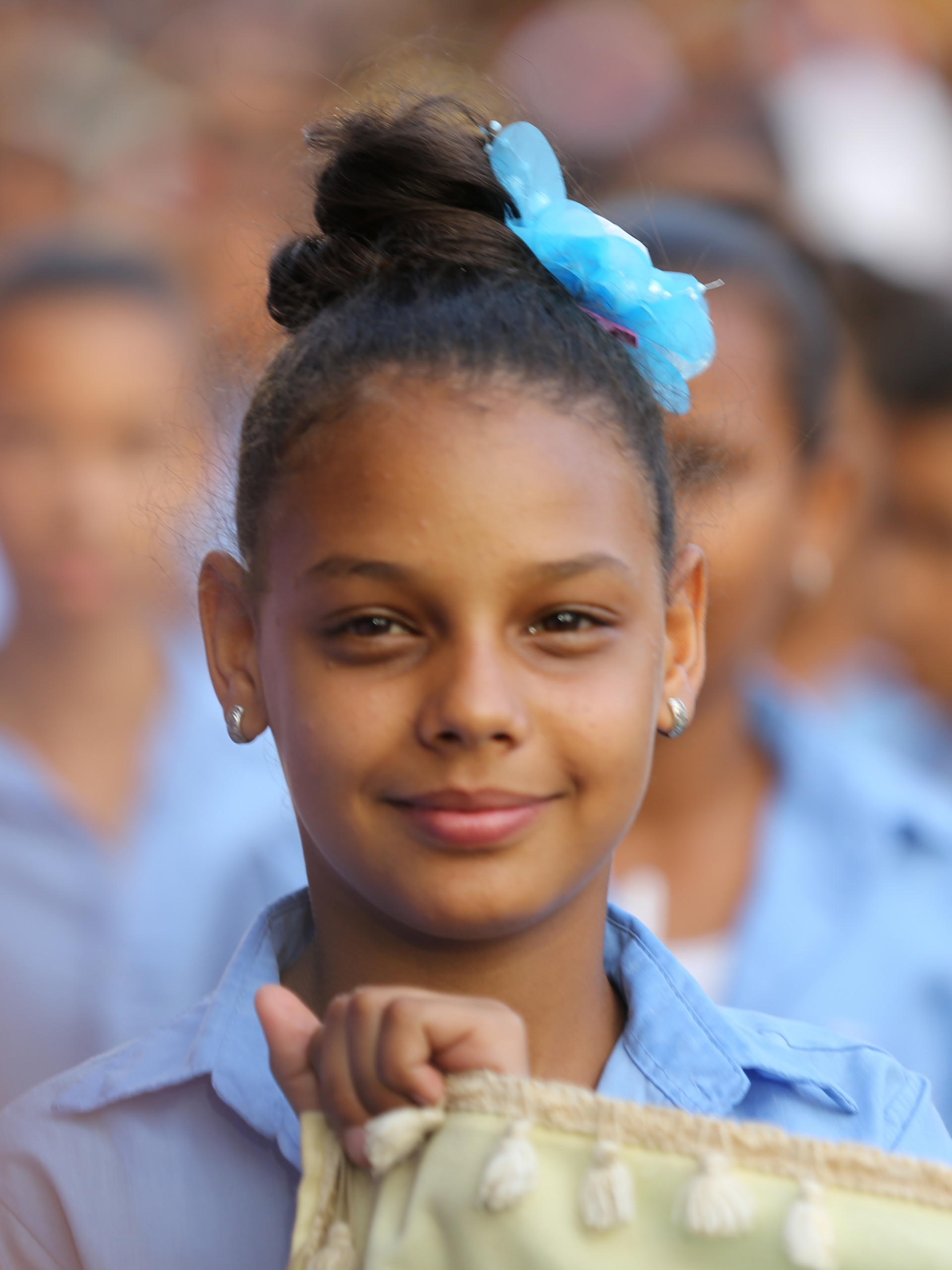 Esta joven, estudiante de escuela pública de Santiago, sostiene la Bandera Nacional, mientras marcha en el desfile en conmemoración a la Batalla del 30 de Marzo de 1844.