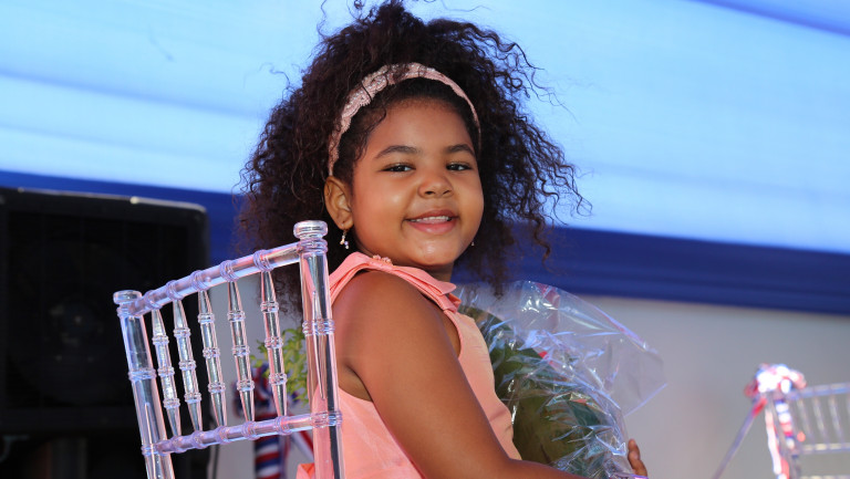 En el acto inaugural, la niña Johanna Taveras entregó flores al presidente Danilo Medina, como muestra de agradecimiento por las obras inauguradas.