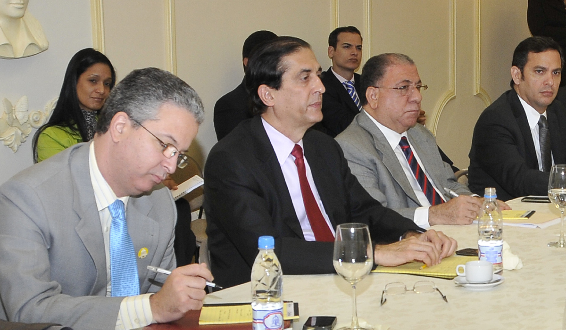 Gustavo Montalvo, ministro de la Presidencia, escucha durante la reunión, en el salón Hermanas Mirabal del Palacio Nacional, de la comisión ampliada para la Reforma de la Policía Nacional e inicio de las medidas contempladas en el Plan Integral de Seguridad Ciudadana.