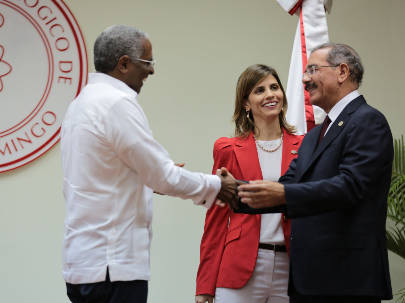 El presidente Danilo Medina es saludado con afecto por el rector del INTEC, Rolando Guzmán, luego de que el jefe de Estado dirigiera breves palabras a los presentes, observa Ana María Ramos, presidenta de la Junta de Regentes del Instituto Tecnológico de Santo Domingo.