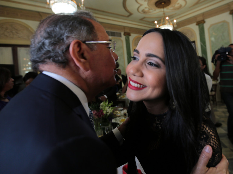 El presidente Danilo Medina saluda a una periodista que participó en el almuerzo por la celebración del Día Nacional del Periodista.
