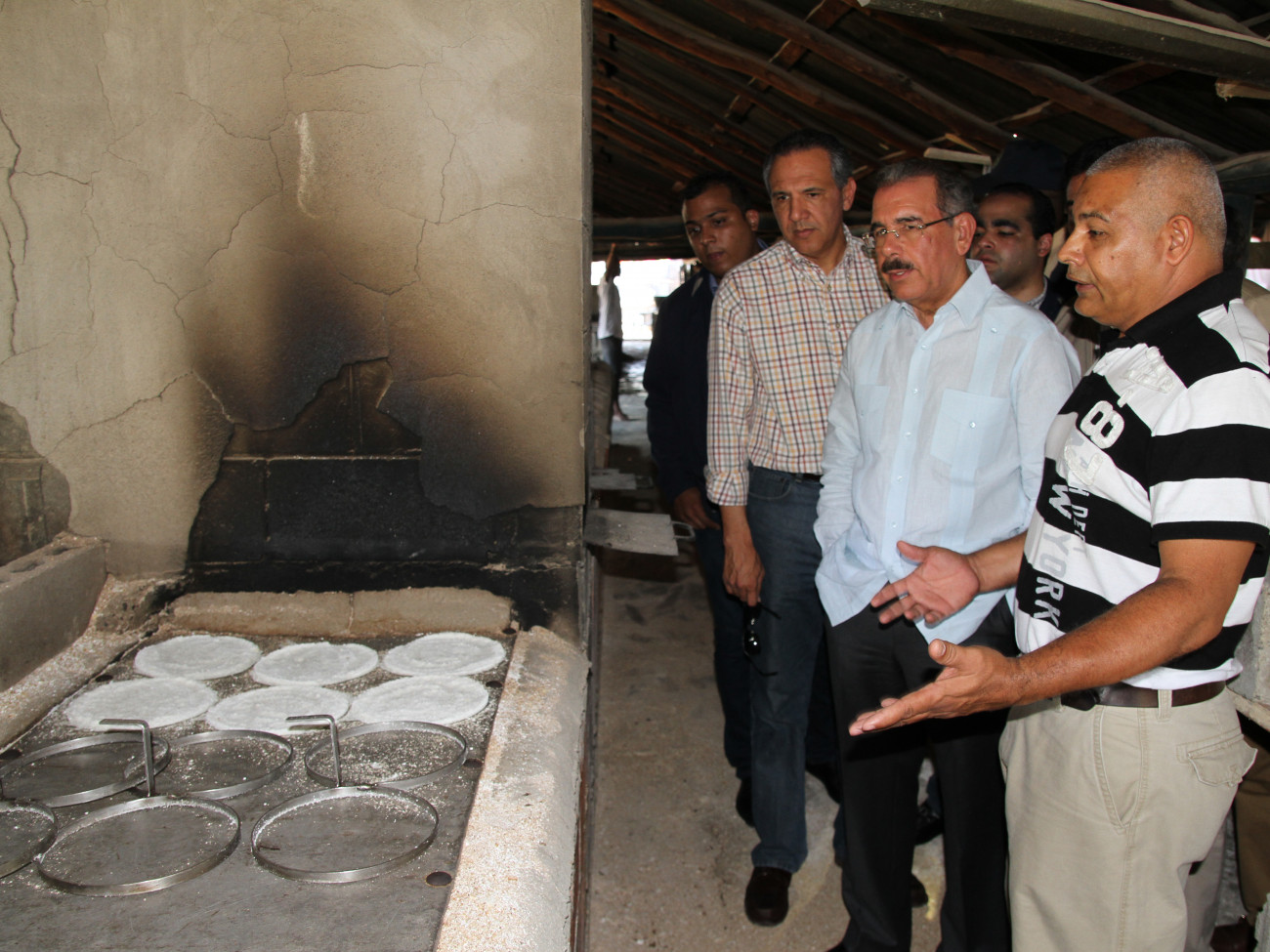 El presidente Danilo Medina observa como se hornean las tortas de casabe en una fábrica de Monción.