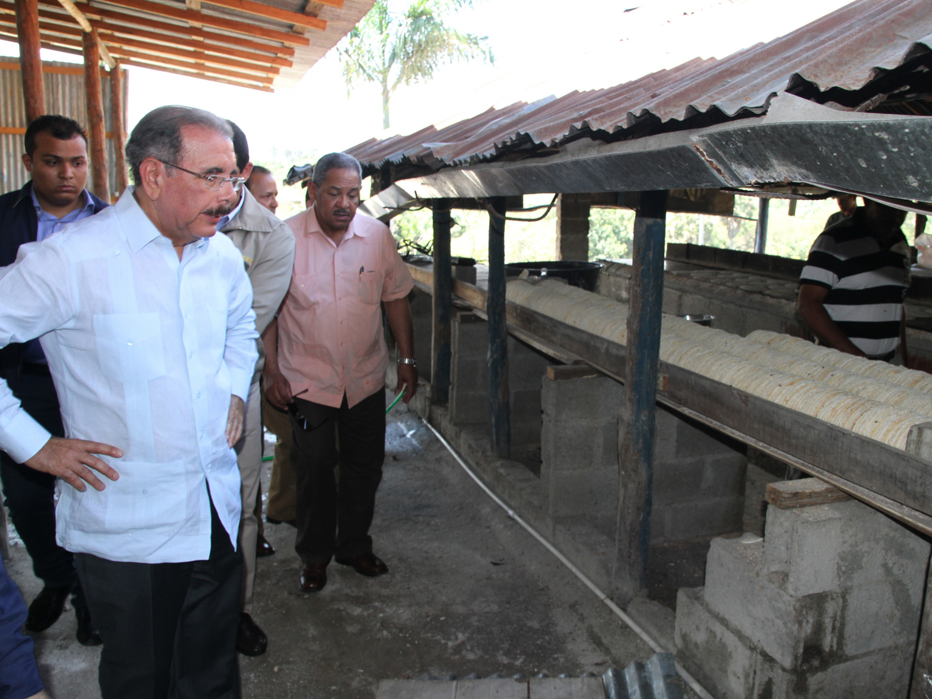 El presidente de la República, Danilo Medina, observa la producción de casabe en una de las fábricas de Monción, Santiago Rodríguez.