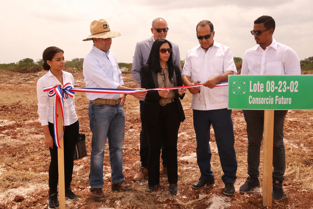Acto de entrega de lotes, encabezado por Lena Ciccone, encargada de la Unidad de Gerencia del Fideicomiso VBC RD, para el inicio de la construcción de viviendas modelo en Ciudad Juan Bosch.