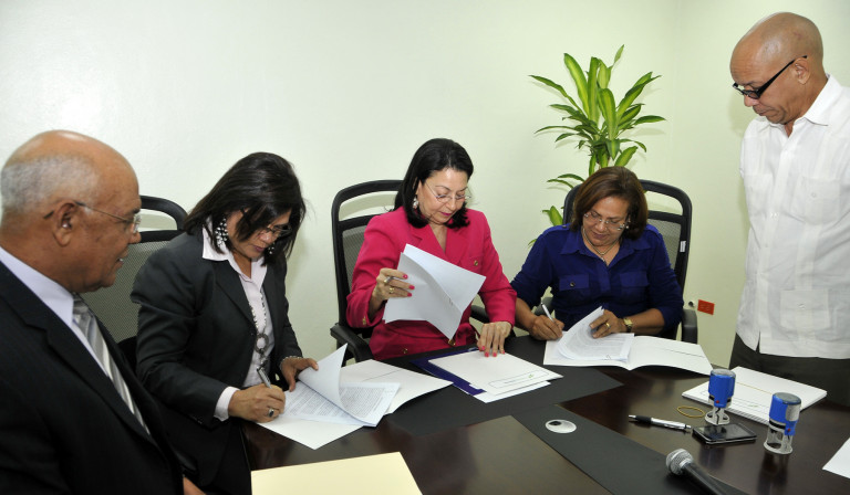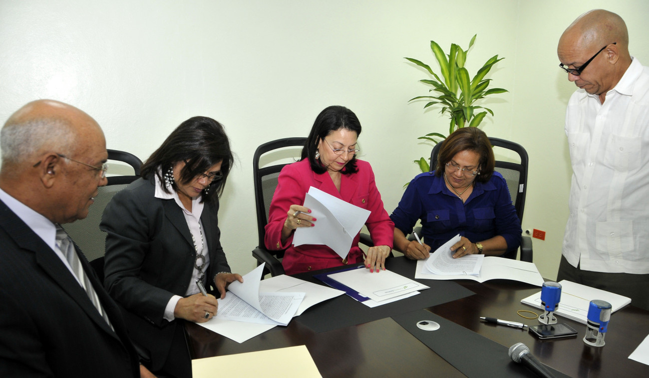 La directora ejecutiva de la Fundación Reservas del País, Rosa Rita Álvarez, entrega la documentación, para que firmen conforme a los recursos recibidos, a los representantes del Centro Dominicano de Desarrollo (CDD) y la Cooperativa de Ahorros y Créditos y Servicios Múltiples de Productores, Campesinos y Microempresarios Azuanos (COOPFEPROCA).