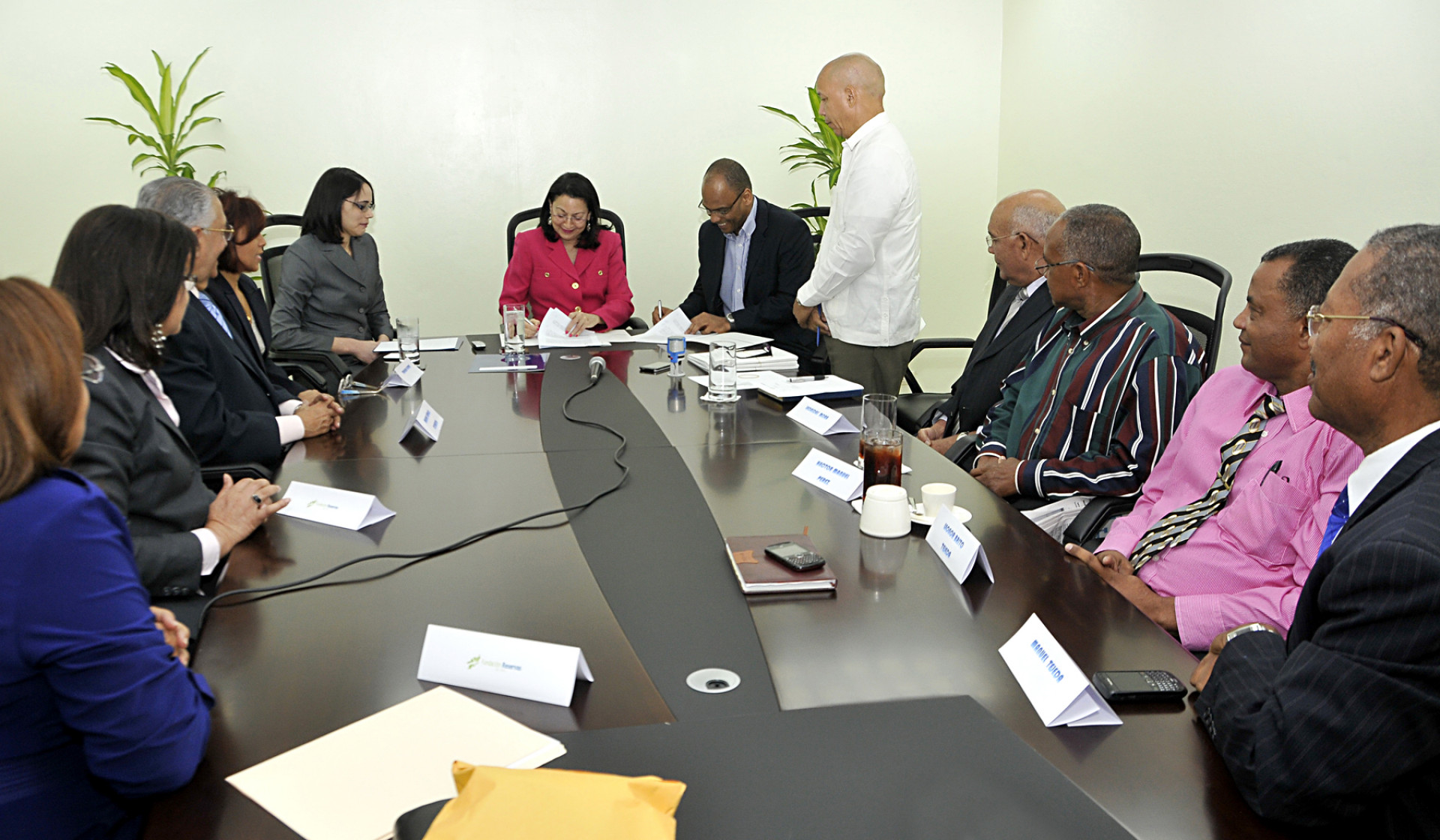 La directora ejecutiva de la Fundación Reservas del País, Rosa Rita Álvarez, en reunión con representantes del sector de las micro y pequeñas empresas, beneficiadas con préstamos de la entidad que dirige.