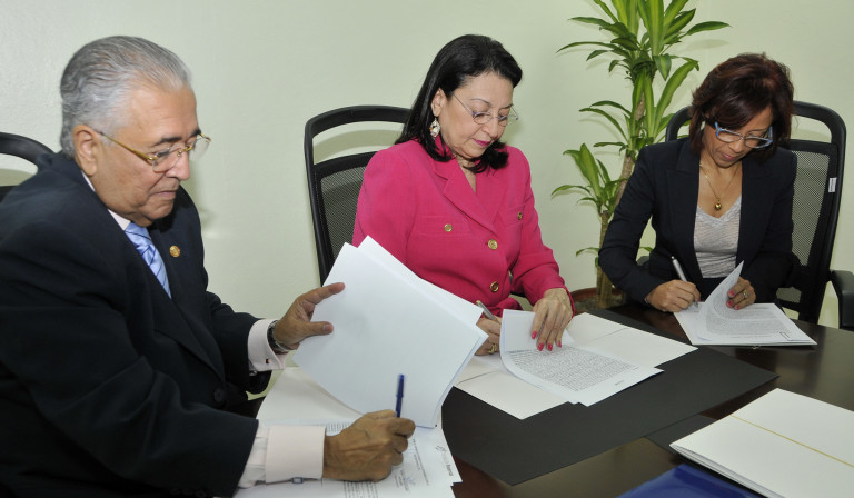 Rosa Rita Álvarez, directora ejecutiva de la Fundación Reservas del País, entidad apéndice del Banco de Reservas, firma convenios y entrega 20 millones de pesos a Manuel Bergés y María Yudelka Flores Pichardo, directivos del Fondo de Inversión para el Desarrollo de la Microempresa (FIME).