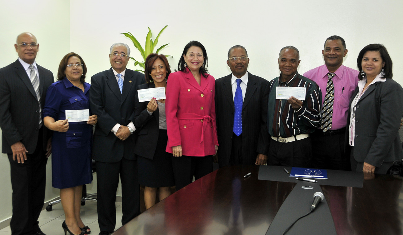 Rosa Rita Álvarez, directora ejecutiva de la Fundación Reservas del País, (centro) y representantes de ONGs que recibieron cheques para trabajar con micro y pequeños empresarios en diferentes zonas del país.