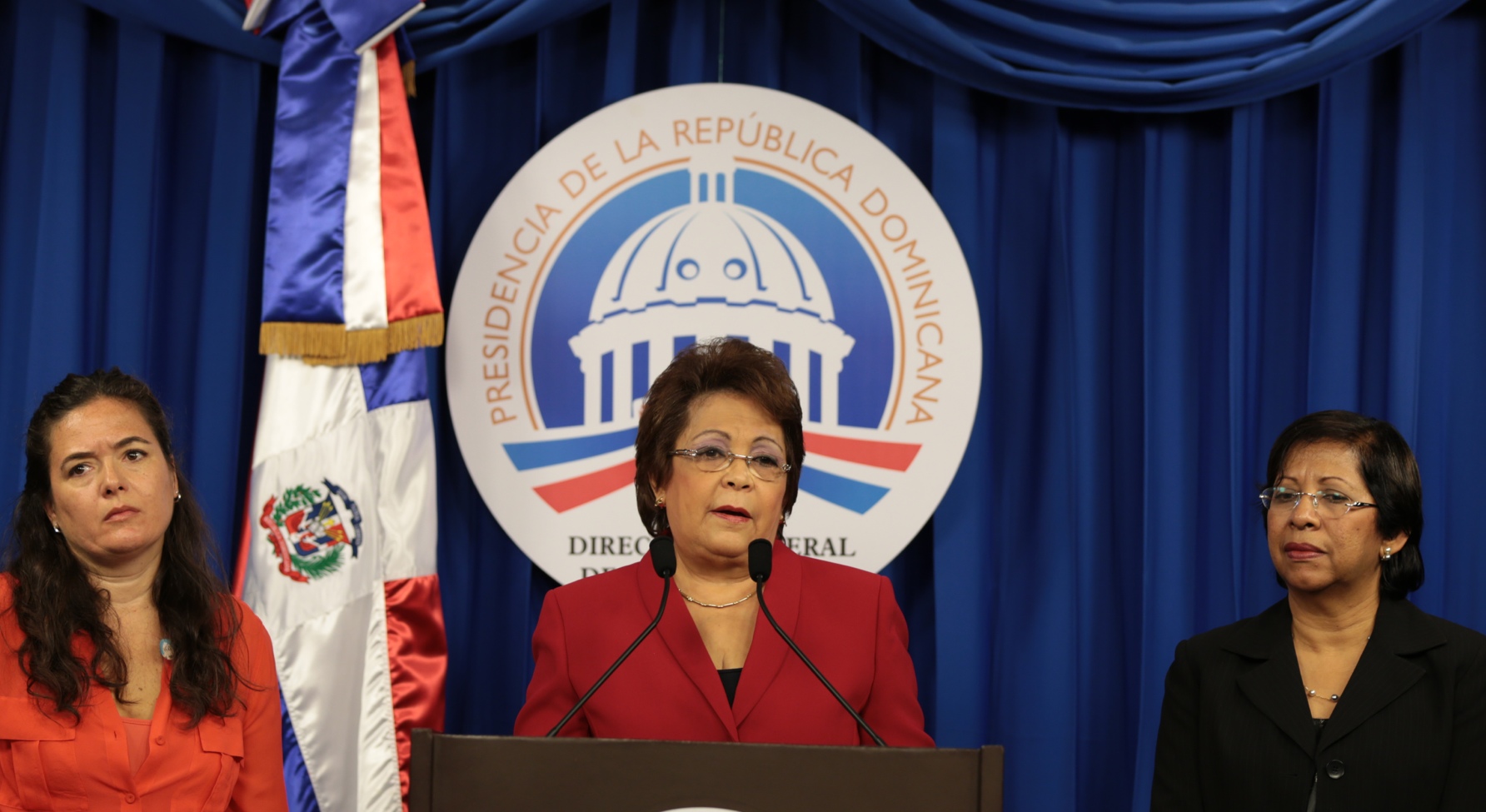 Alejandrina Germán, ministra de la Mujer, habla con los periodistas, que cubren la fuente Palacio Nacional, en el salón Orlando Martínez de la Casa de Gobierno, donde anunció que el país será anfitrión de la XII Conferencia sobre la Mujer de América Latina y el Caribe de la CEPAL, prevista de 14 al 18 del mes de octubre.