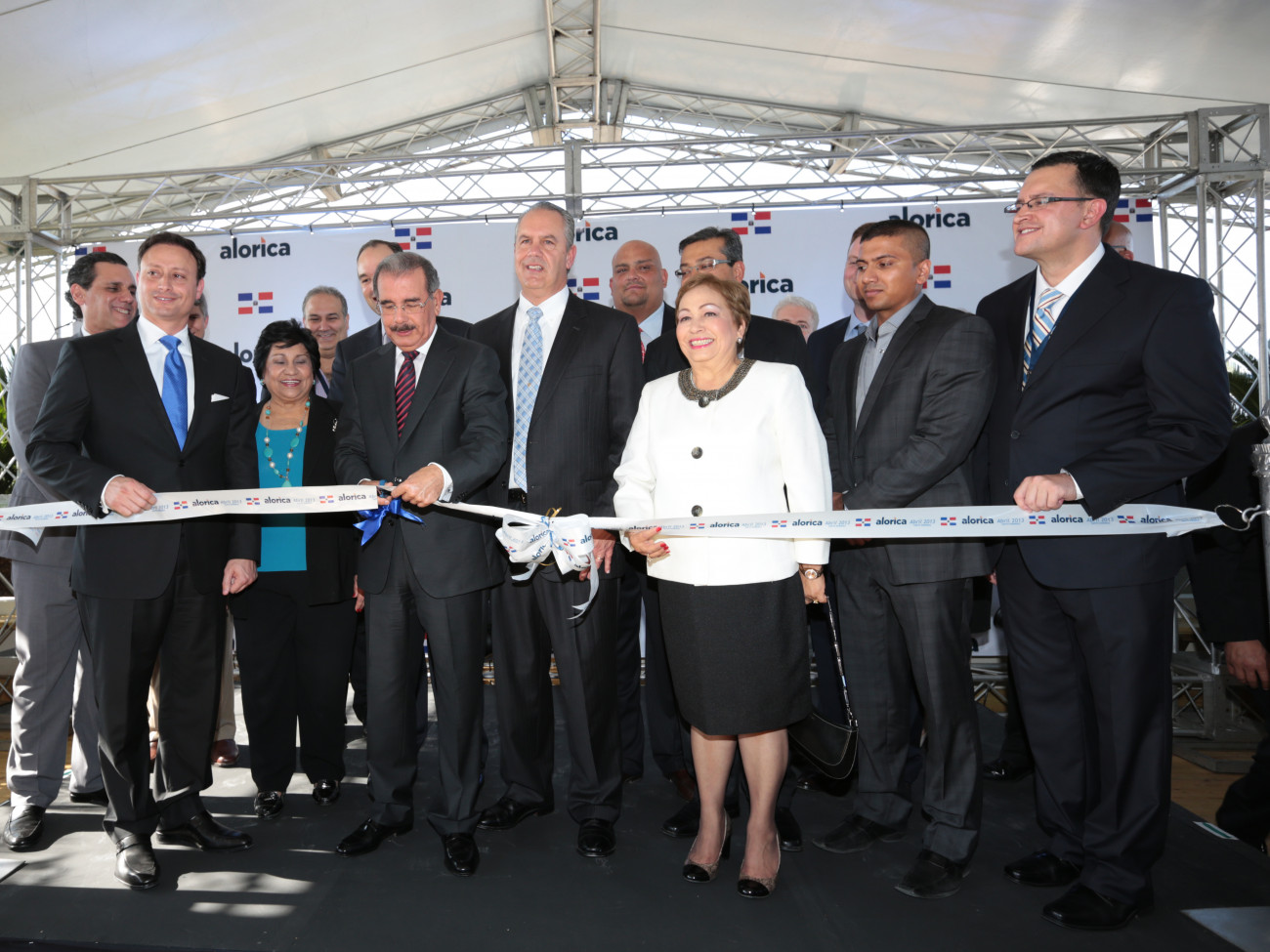 El presidente de la República, Danilo Medina, corta la cinta para dejar inauguradas las instalaciones de la empresa de zona franca especial Alórica. Le acompañan Art Dibari, jefe de operaciones globales de Alórica; y Luisa Fernández, directora del Consejo Nacional de Zonas Francas de Exportación, entre otras distinguidas personalidades.