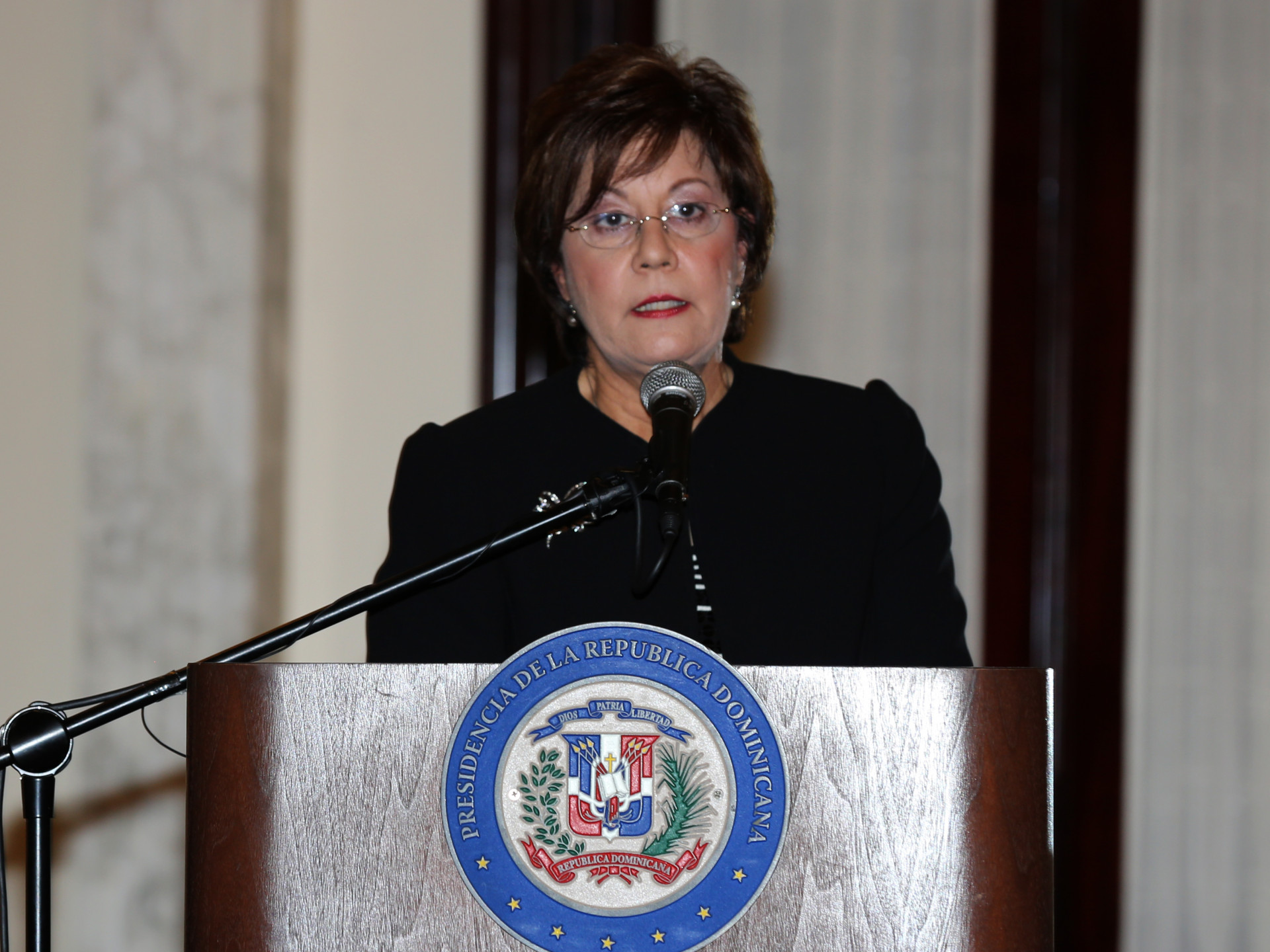 La ministra de Educación, Josefina Pimentel, se dirige a los presentes en la ceremonia de entrega del premio al ganador del Concurso Nacional para el Diseño del Pupitre Dominicano, en el salón Las Cariátides del Palacio Nacional.