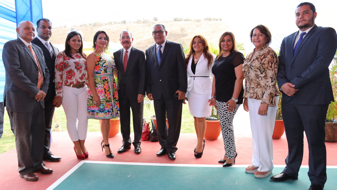 Presidente Danilo Medina (al centro) junto a Nelly Melo, gobernadora de la provincia Peravia; Lidia Beriguete, directora del centro educativo inaugurado; Miguel Franjul, y la diputada Licelot Arias, entre otras distinguidas personalidades.