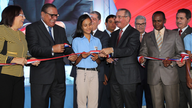 El presidente Danilo Medina corta la cinta durante acto inaugural conjunto por la Escuela Profesoras Hermanas Bucarelly, en Las Colinas y Escuela Prof. Milagros Altagracia Melo, ubicada en Salinas de Puerto Hermoso, ambas en la provincia Peravia.