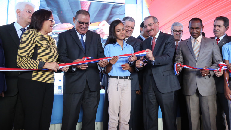 El presidente Danilo Medina corta la cinta durante acto inaugural conjunto por la Escuela Profesoras Hermanas Bucarelly, en Las Colinas y Escuela Prof. Milagros Altagracia Melo, ubicada en Salinas de Puerto Hermoso, ambas en la provincia Peravia.