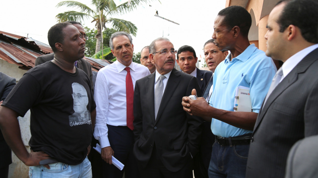 El presidente Danilo Medina escucha la situación que se ha presentado con el colapso de la cañada El Arrozal, del sector La Ciénaga, donde recorrió diferentes calles y callejones de la popular barriada para contactar el mal estado de la cañada.